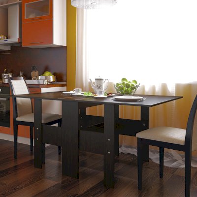Практичный вариант для малогабаритного помещения – стол-книжка Стандарт. Габариты в разложенном виде (ШхВхГ): 1000х750х1600 мм. При необходимости столешница компактной модели раскладывается на две стороны и превращается в полноценный обеденный стол, за которым поместится немало гостей. Изделие выполнено из высококачественной ЛДСП.