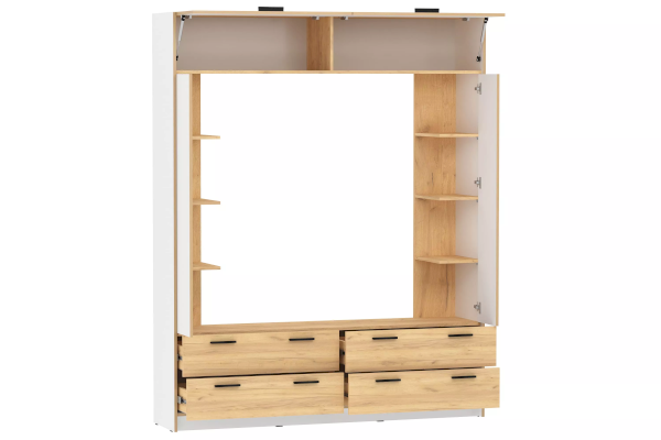 Шкафчики в верхней части стенки оснащены удобными дверками с открытием вверх. Скрытые полки за распашными дверками в средней части изделия придутся по вкусу любителям книг и интерьерных мелочей. Нижнюю часть стенки занимают четыре вместительных выдвижных ящика на шариковых направляющих, позволяющие аккуратно разместить вещи. Шкаф является модульным, что позволяет комбинировать его с другими шкафами и тумбами из одноименной коллекции. Лаконичный дизайн шкафа гармонично подчеркивается черными ручками.