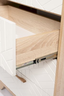 Комод Амстердам — вместительный и функциональный элемент как для спальни, так и гостиной. Модель оснащена тремя большими ящиками для хранения предметов одежды, текстиля и двумя маленькими — для личных вещей, документов, аксессуаров. Конструкцией предусмотрены шариковые направляющие полного выдвижения.