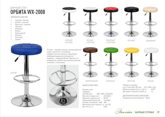 Барный стул (без спинки) ОРБИТА WX-2008 непременно придется вам по вкусу и создает в кафе неповторимую атмосферу. Основа барного стула ОРБИТА WX-2008 - мощная стальная хромированная опора, которая крепится к надежному основанию в форме плоского диска и гарантирует требуемый уровень устойчивости. Простое, но удобное сиденье, толщиной 80 мм, и оригинальное сочетание цветов обивки обеспечат посетителю комфорт.