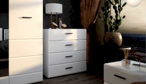 Стильный комод Йорк — оптимальное решение для спальни и гостиной. Горизонтальная фрезеровка фасадов, контрастные черного цвета ручки и задняя стенка из ХДФ, элегантный белый цвет— все это делает модель универсальной, позволяет сочетать ее с любой мебелью и отделкой. Блеск глянцевых фасадов High Gloss из МДФ наполняют комнату светом, делают ее просторнее. Ящики на телескопических направляющих, позволяют рационально использовать всё внутреннее пространство ящиков, обеспечивая удобный и легкий доступ ко всему содержимому. Мебель выполнена из экологически безопасных и надежных материалов.