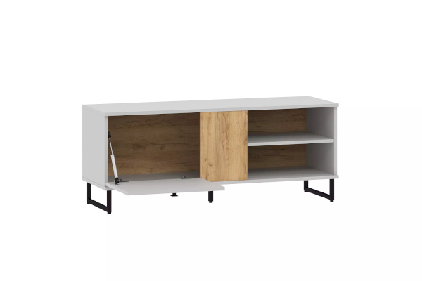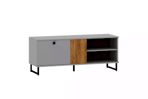 Тумба оснащена открытыми нишами и полкой, в которых можно удобно разместить видео- и аудиоаппаратуру или предметы интерьера.