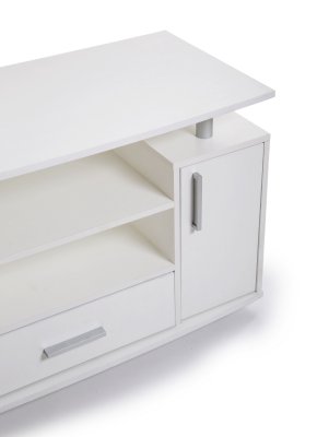 Удобная телевизионная тумба с открытыми полками для аудио/видео-аппаратуры, закрытыми полками и вместительным выдвижным ящиком.