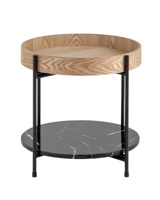 Круглый журнальный столик в современном минималистичном дизайне впишется в любой интерьер. Столешница выполнена из МДФ и покрыта шпоном из ясеня. Высокие бортики по краям предотвращают падение предметов со столика. Нижняя полка из МДФ с рисунком под мрамор идеально подойдет для хранения книг или журналов. Черный металлический каркас выдерживает нагрузку до 50 кг. Пластиковые подпятники в основании ножек защищают напольные покрытия от царапин и предотвращают скольжение.
