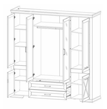 Два из трех верхних отделений за распашными дверцами скрывают полки, а центральное оборудовано штангой для развешивания одежды на плечиках.