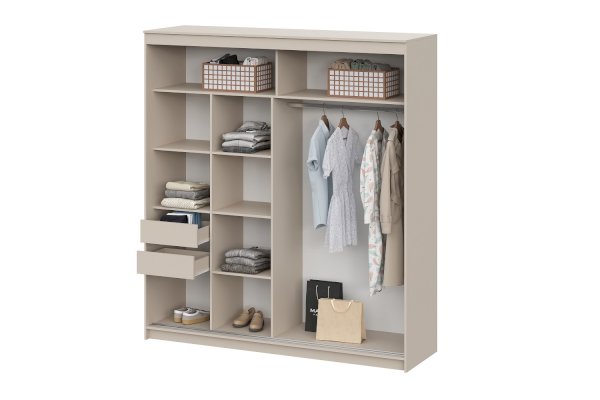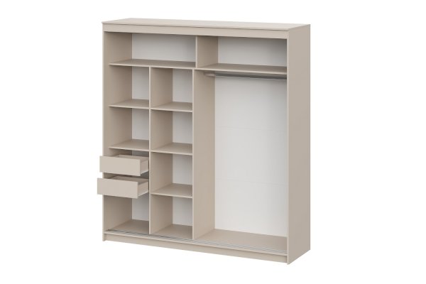 Внутреннее наполнение шкафа включает удобные полки и два выдвижных ящика с одной стороны, а также вместительную платяную секцию с надёжной металлической штангой для одежных вешалок за другой створкой. Нижнеопорная система раздвижных створок обеспечивает лёгкое и ровное открытие.