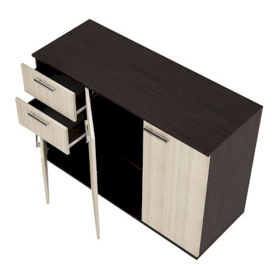 Комод Стандарт №3 шириной 1200 мм имеет необычное размещение полок и ящиков. Основная часть изделия состоит из двух распашных дверок, за которыми находятся места для хранения вещей. Левая часть комода представляет собой два выдвижных ящика и нижнюю секцию также с распашной дверцей и полками.