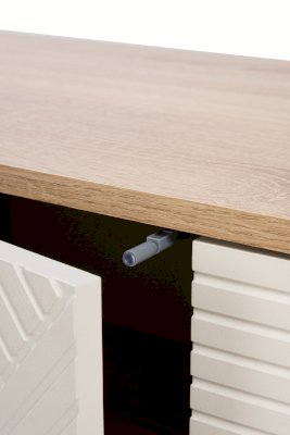 Модель оснащена шестью выдвижными ящиками на шариковых направляющих полного выдвижения. Между ящиками за створкой располагается ниша с двумя полками. Створка крепится на петли с доводчиком для плавности хода. Для открывания ящиков установлены ручки из массива дуба, на створке конструкцией предусмотрен механизм «push-to-open».