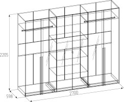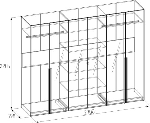 Шестидверный шкаф для одежды и белья с зеркалами — находка для спальни любых габаритов. Продуманное внутреннее наполнение шкафа делает его поистине универсальным. Шкаф оснащен отделениями для хранения белья с регулируемыми по высоте полками и отделением для одежды со стационарной штангой.