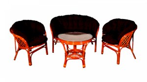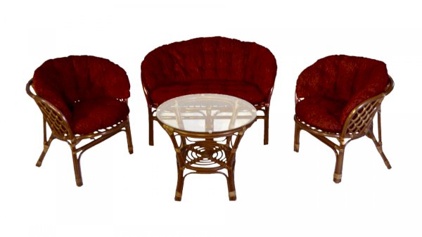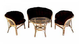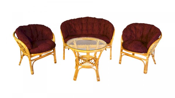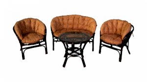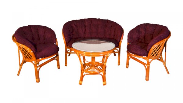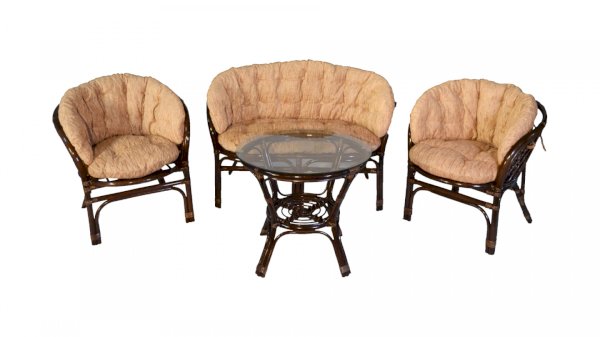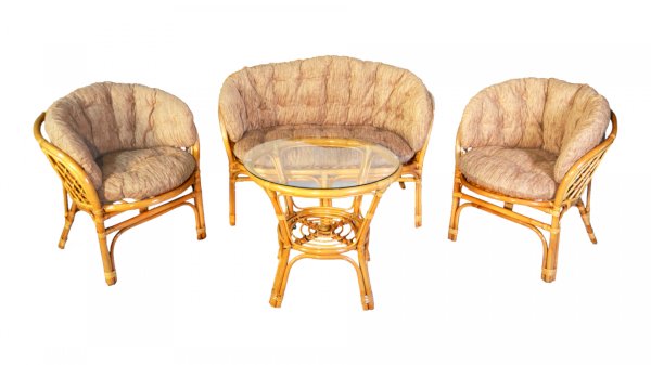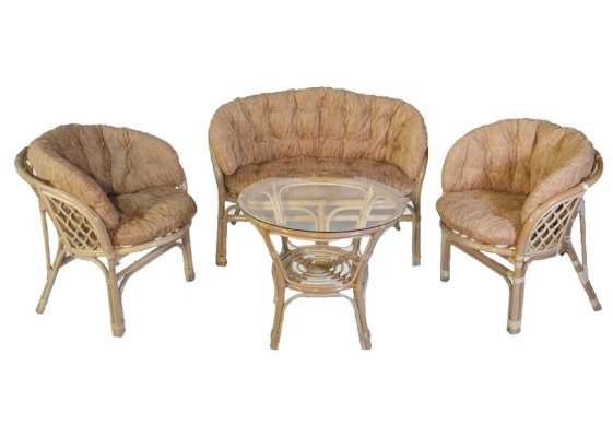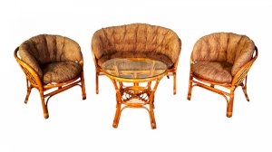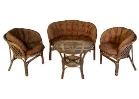 Комплект из натурального ротанга, состоящий из дивана, двух кресел и круглого столика со стеклом.