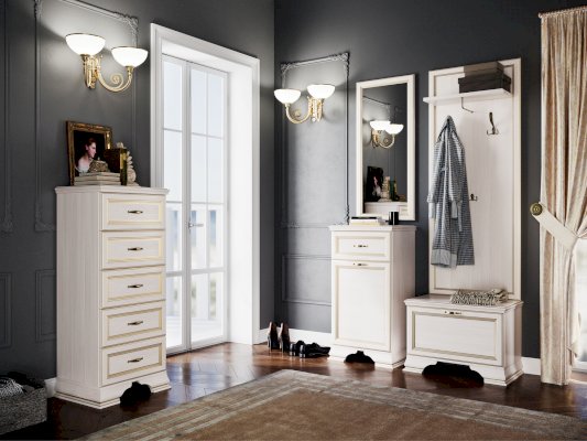Классический стиль в мебели предполагает надёжную конструкцию с правильными и простыми геометрическими формами, а в качестве декора используются всевозможные элементы, такие как рельефные профили, массивные опоры и изысканная фурнитура. Цветовая гамма ЛДСП и МДФ «Бодега белый» сочетается с благородной золотой патиной и наполняет дом атмосферой тепла уюта. Последний штрих в образе классического комода - это лицевая фурнитура в виде металлических ручек цвета старая бронза.