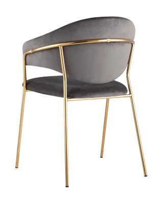 Стильный кухонный стул с оригинальной формой спинки, высокой поддержкой и подлокотниками. В качестве обивки используется мягкий вельвет. Металлический каркас золотого цвета огибает спинку и выступает аккуратным акцентом модели. Широкое сиденье обеспечивает удобную посадку и уют.